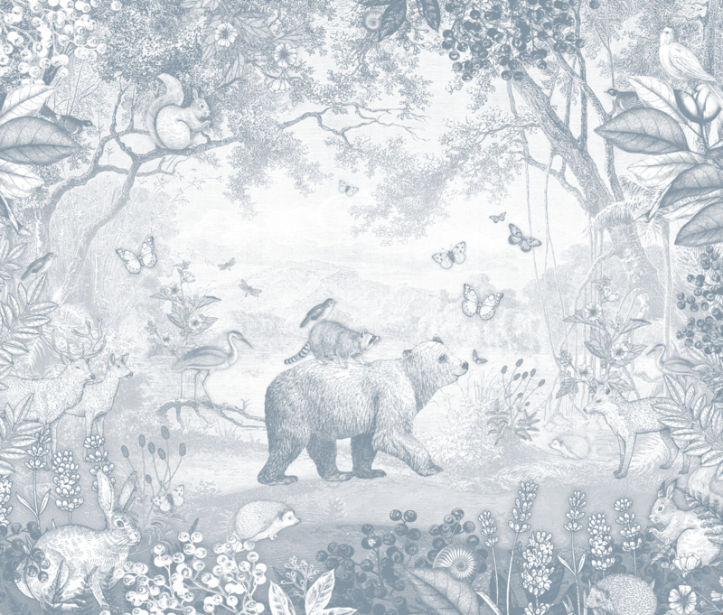 Dit bos vol dieren is een klassiek Toile de Jouy behang in een nieuw jasje. Het ontwerp geeft een mooi doorkijkje in het bos en er is genoeg te ontdekken voor je kindje; de grote beer met wasbeer en vogel op z’n rug, het vosje dat toekijkt en de herten die genieten in de zon. Hier en daar zie je een eekhoorn, een vlinder en een vogel!