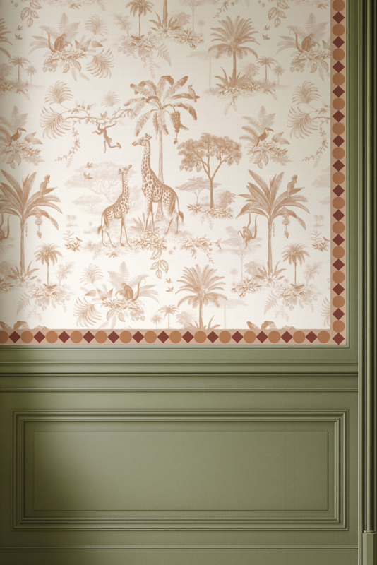 Een behangrand is verrassend veelzijdig. Je kunt het langs het plafond aanbrengen, halverwege de muur als speels accent of boven een lambrisering, een bed, bureau of speelhoek. Gebruik de behangrand om verf en behang met elkaar te verbinden of om een mural te omlijsten.