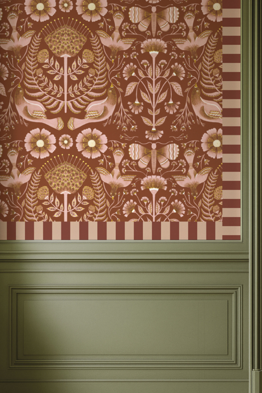 Behangrand Streep | zeegroen & steenroodPrachtige behangrand uit de collectie van Pimpelmees! Dit is behangrand Streep in de kleuren zeegroen & steenrood.